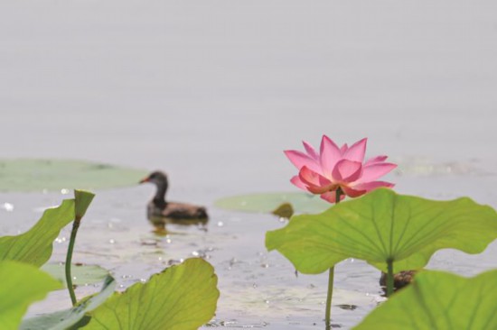 6月17日,在嘉興秀洲區秀湖,盛開的荷花映襯湖面,幾只水鳥自由游弋,構成一幅夏日美麗圖景。(張啟帆)?!?/a>