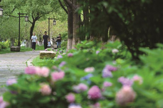 6月9日,在嘉興市區南湖邊幽靜的林間小徑旁,一簇簇的繡球花競相綻放,紫色、粉色、淡藍色……怒放的花朵形成延綿的“花境”,在綠意盎然的枝葉間搖曳生姿。(張啟帆)?!?/a>