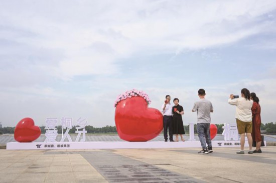5月20日,嘉興桐鄉市鳳凰湖畔,粉色玫瑰點綴在大顆愛心上,浪漫氛圍直接拉滿,市民紛紛駐足打卡,定格下“與你‘桐’享”的美好瞬間。(孟多多、裴清華)?!?/a>