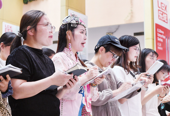 5月14日,在浙江義烏國際商貿城外語晨練基地,市場商戶跟著老師學習西班牙語。學習時間為周一至周五的上午,商戶們在開門營業前,學習西班牙語外貿用語,以便與外國客戶溝通交流?!?/a>