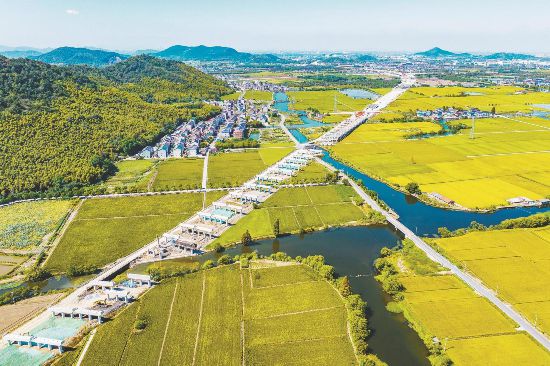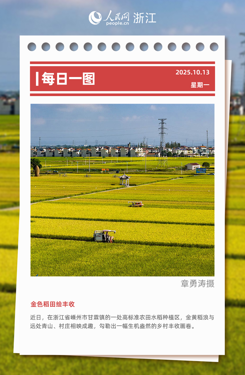 人民網紹興10月11日電 (章勇濤)今天,在浙江省嵊州市甘霖鎮的一處高標準農田水稻種植區,金黃稻浪與遠處青山、村莊相映成趣,勾勒出一幅生機盎然的鄉村豐收畫卷。 近年來,嵊州市依托萬畝糧食生產基地,引導農民選育小吃原輔料優質品種?!?/a>