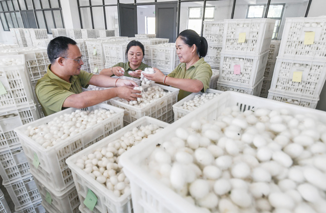 10月11日,在金華市武義縣桃溪鎮澤村小蠶共育共富工坊,該鎮8個村莊養蠶戶運來一筐筐蠶繭,出售給上門收購的客商。 據介紹,客商收購的蠶繭主要用于孕育下一代蠶種,售價比普通蠶繭顯著提高?!?/a>