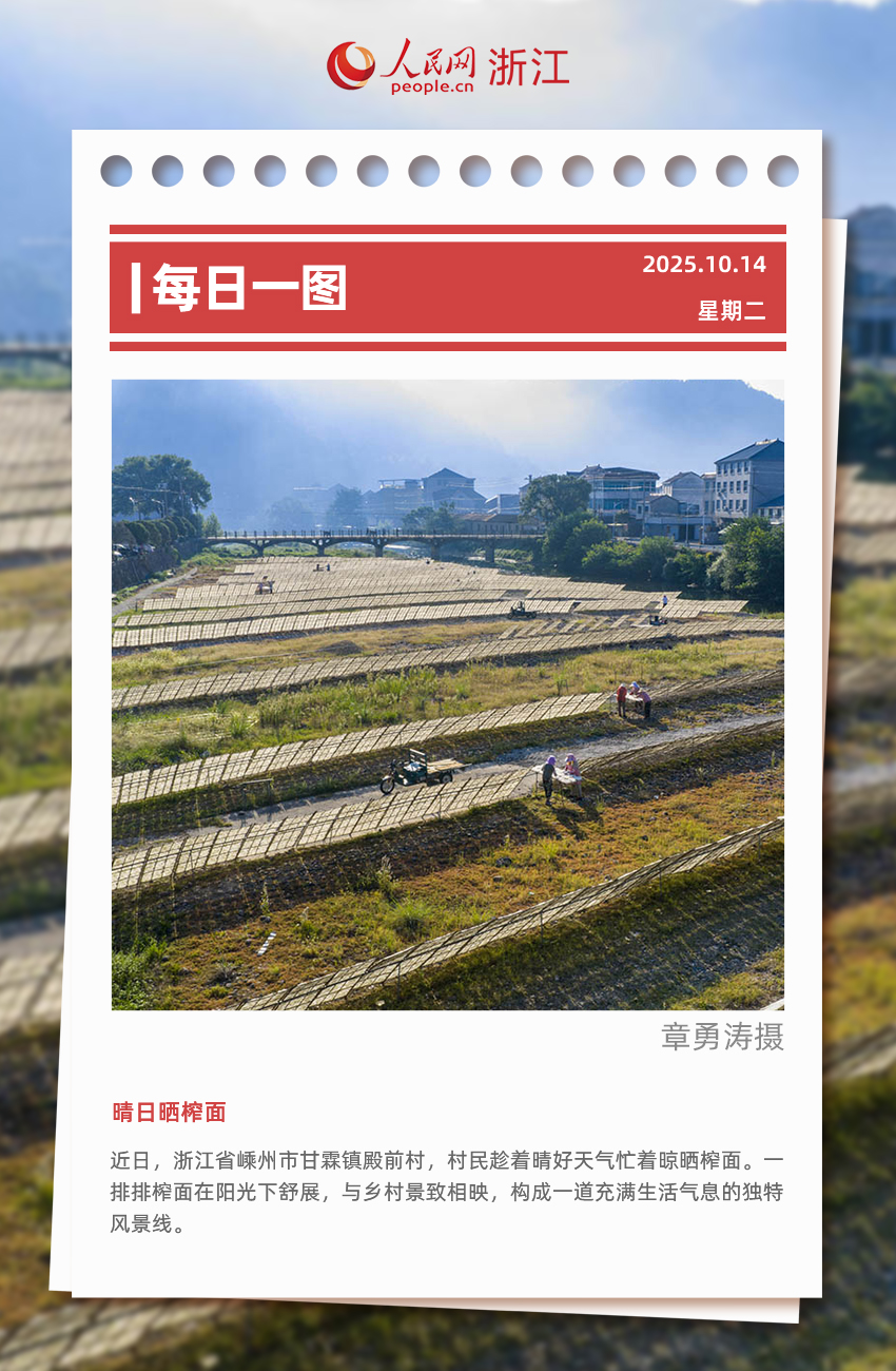 人民網杭州10月13日電 (章勇濤)近日,浙江省嵊州市甘霖鎮殿前村,村民趁著晴好天氣忙著晾曬榨面。一排排榨面在陽光下舒展,與鄉村景致相映,構成一道充滿生活氣息的獨特風景線?!?/a>