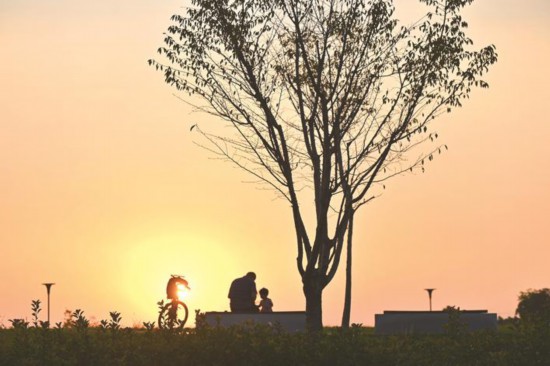 10月11日傍晚,在嘉興市區秀湖公園內,家長陪伴孩子玩耍,天空在落日余暉的映襯下呈現出溫馨的橙黃色。(王嘉寧)?!?/a>