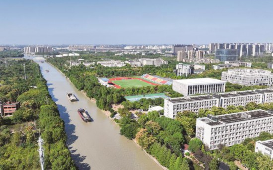 10月10日,在大運河嘉興段的航道上,往來貨船絡繹不絕,兩岸樹木郁郁蔥蔥,城市建筑錯落有致,呈現出一派和諧的發展景象。(俞中岳)?!?/a>