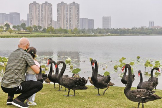 10月13日,氣溫稍降,市民在嘉興秀洲區秀湖畔與黑天鵝合影嬉戲,享受清涼舒適的戶外時光。(王蓉)?!?/a>