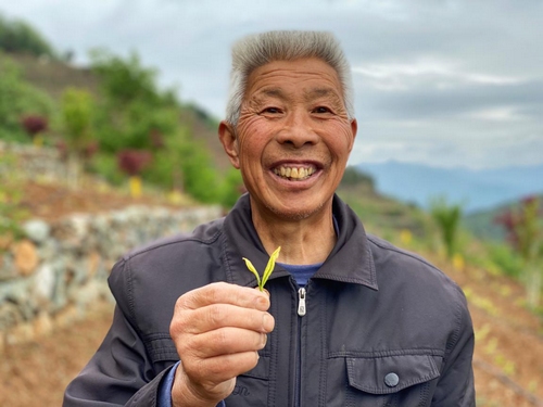 青川縣沙州鎮青坪村村民焦元恩談起白茶,樂得合不攏嘴。朱虹攝