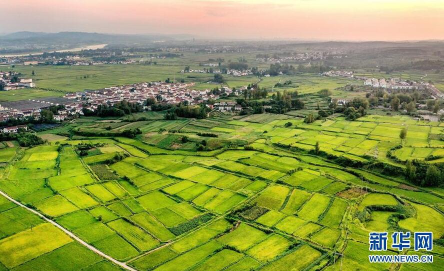 夕陽下的洋縣戚氏街道的稻田(8月28日攝,無人機照片)。