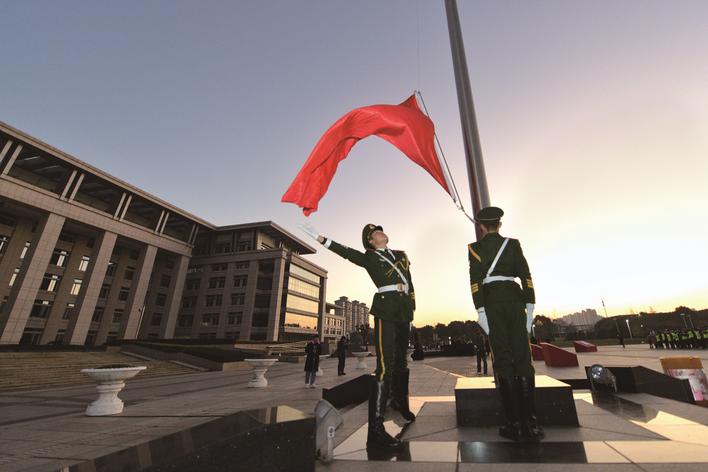 1月1日早晨6:54,嘉興市南湖區行政中心廣場迎來了一場莊嚴的升國旗儀式,醫務工作者、現役軍人、公安干警、教師、少先隊員、志愿者、機關干部等600多位各界代表,列成方陣,高唱國歌,注視著五星紅旗迎著新年的朝陽冉冉升起。新年第一場升國旗儀式,表達了南湖兒女祝福祖國繁榮昌盛、慶祝中國共產黨成立100周年的喜悅心情。