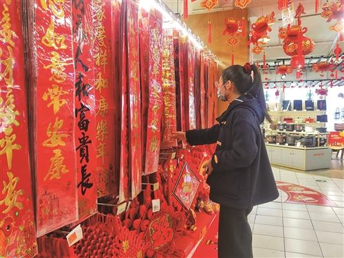春節即將到來,不少商家掛上了紅色喜慶的裝飾品,充斥著濃濃的春節氛圍。1月26日,在世紀聯華臺州市府大道店,早已進入年貨消費旺季。前來購物的顧客熙熙攘攘,戴著口罩在挑選對聯、年貨、生活物品等,充滿了年味。(沈海珠)