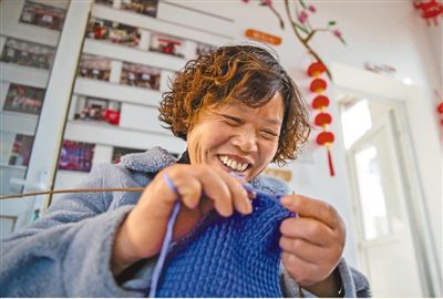 “長河媽媽”倪調娟正在編織圍巾。