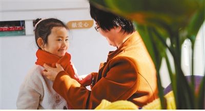 “長河媽媽”楊娟芬讓孫女試試圍巾的長度。