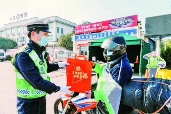 連日來,金華交警在S315省道洋埠春運服務站內,向過往的駕駛員贈送包含防疫物資、姜茶、“!弊趾蜏p分學習的平安禮包。金華交警部門深入車站、服務區、企業等地,向旅客宣傳疫情防控知識和交通法律法規,并發出溫馨提示,營造春運期間道路交通安全良好的社會氛圍。