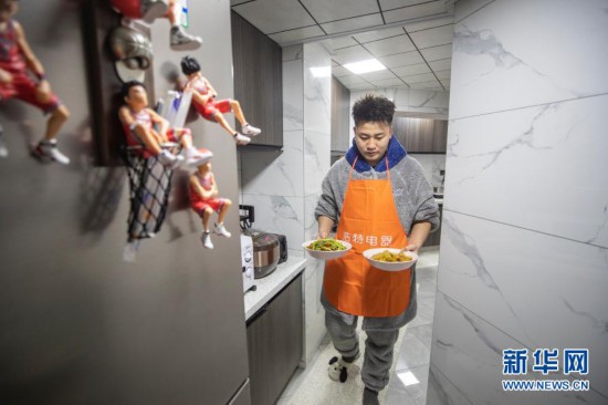 2月11日,余源將烹飪好的菜品端上桌。