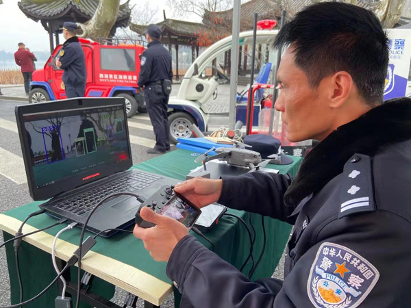 民警正在調試無人機。杭州西湖景區公安分局供圖