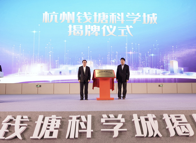 浙江省副省長高興夫,杭州市副市長、錢塘新區黨工委書記柯吉欣共同為杭州錢塘科學城揭牌,標志著杭州錢塘科學城正式設立。錢塘新區供圖