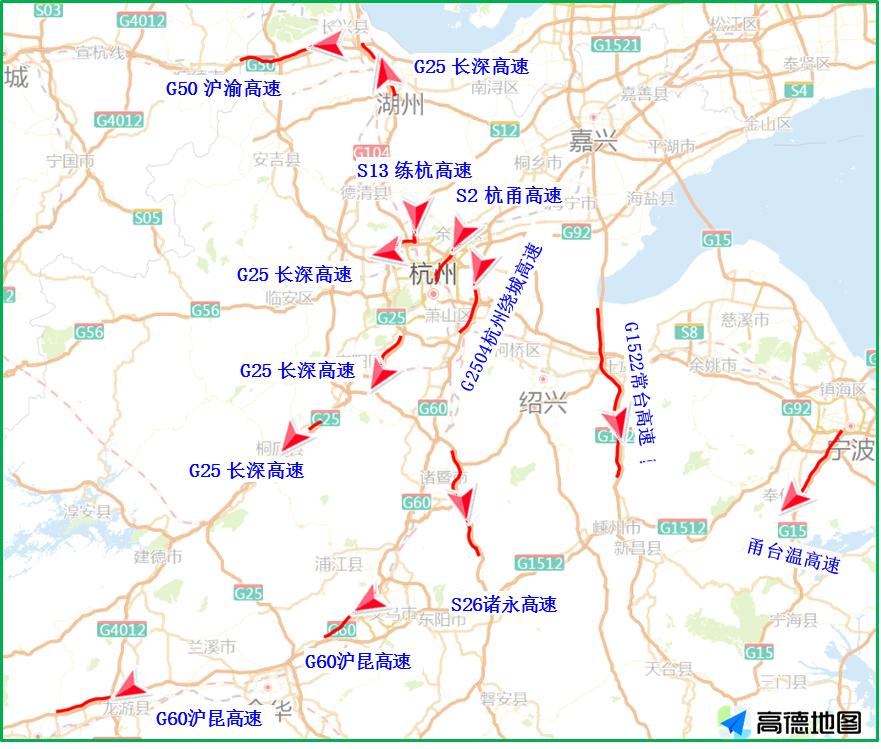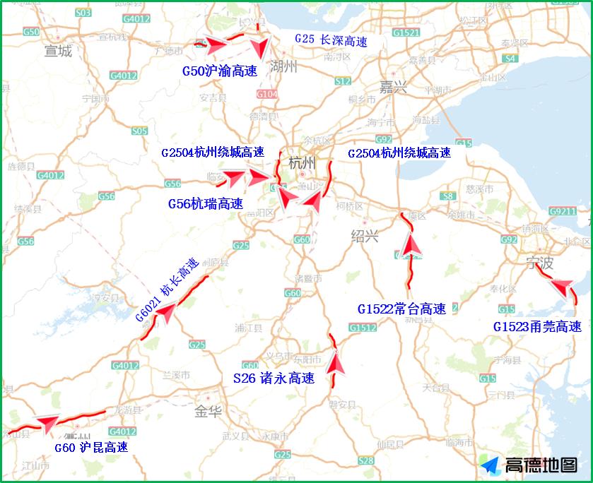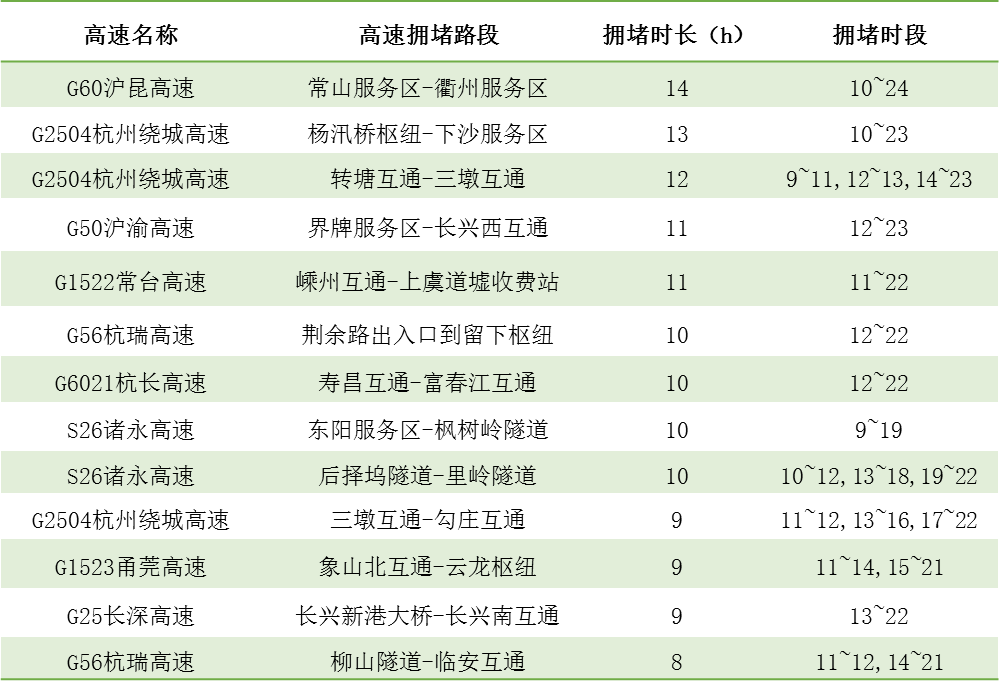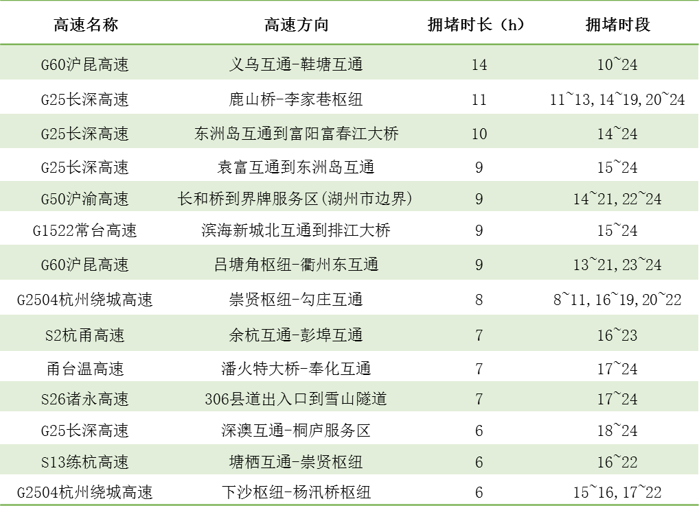 因高速公路流量大幅增長,局部路段、節點發生交通事故和擁堵風險將大大提升。其中,節日第一天流量最大,尤其以杭金衢、諸永、上三高速出程流量集中的特征更為明顯。大中流量線路為杭金衢呂塘角樞紐至五里樞紐段、杭金衢金華至游埠段、杭新景杭州南至善嶺隧道段、常臺高速沽渚樞紐至章鎮段、甬臺溫貓貍嶺至黃土嶺段等路段,部分臨近景區的收費站由于地方道路限制影響,會發生倒灌主線的情況,例如西塘、烏鎮、橫店、西湖周邊、雁蕩山等收費站。