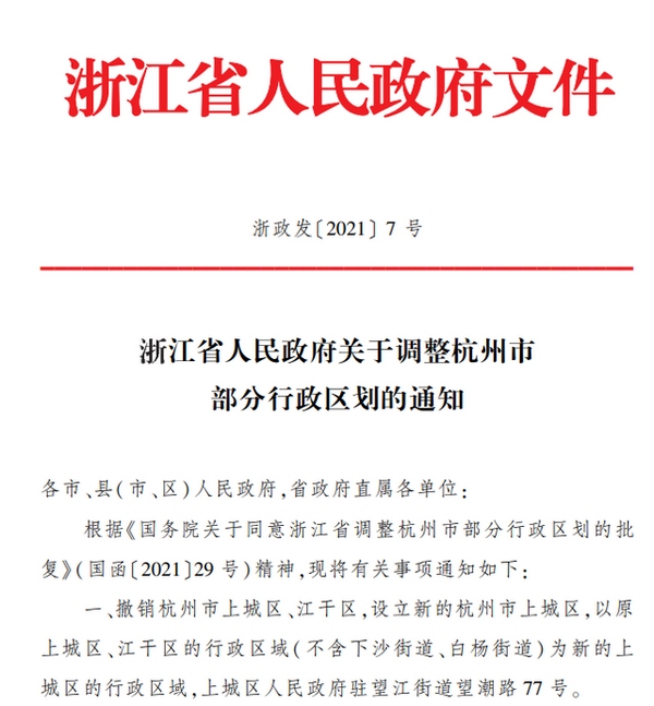 據《通知》發布,撤銷杭州市上城區、江干區,設立新的杭州市上城區,以原上城區、江干區的行政區域(不含下沙街道、白楊街道)為新的上城區的行政區域,上城區人民政府駐望江街道望潮路77號。