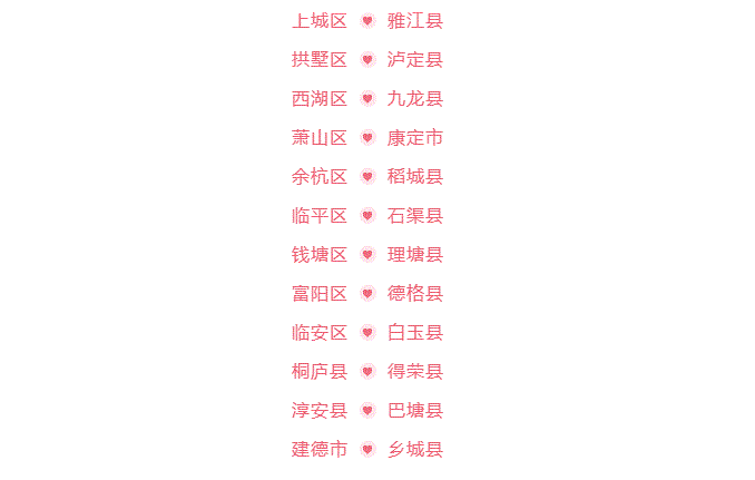 杭州將結對四川省18個縣(市、區),分別為:甘孜州的康定市、瀘定縣、九龍縣、雅江縣、稻城縣、理塘縣、鄉城縣、得榮縣、巴塘縣、石渠縣、德格縣、白玉縣等12個縣市;廣元市的青川縣、朝天區、昭化區、旺蒼縣、蒼溪縣、劍閣縣等6個縣區。