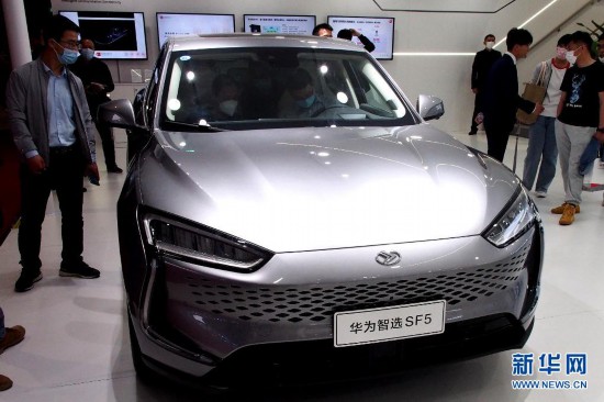 4月28日,觀眾在上海車展現場參觀國產華為智能電動車。