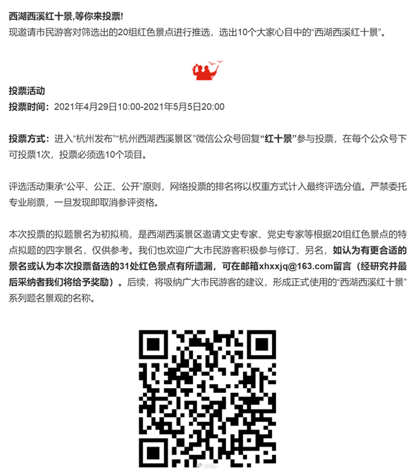 西湖西溪景區邀請市民游客對篩選出的20組紅色景點進行推選,選出10個大家心目中的“西湖西溪紅十景”。