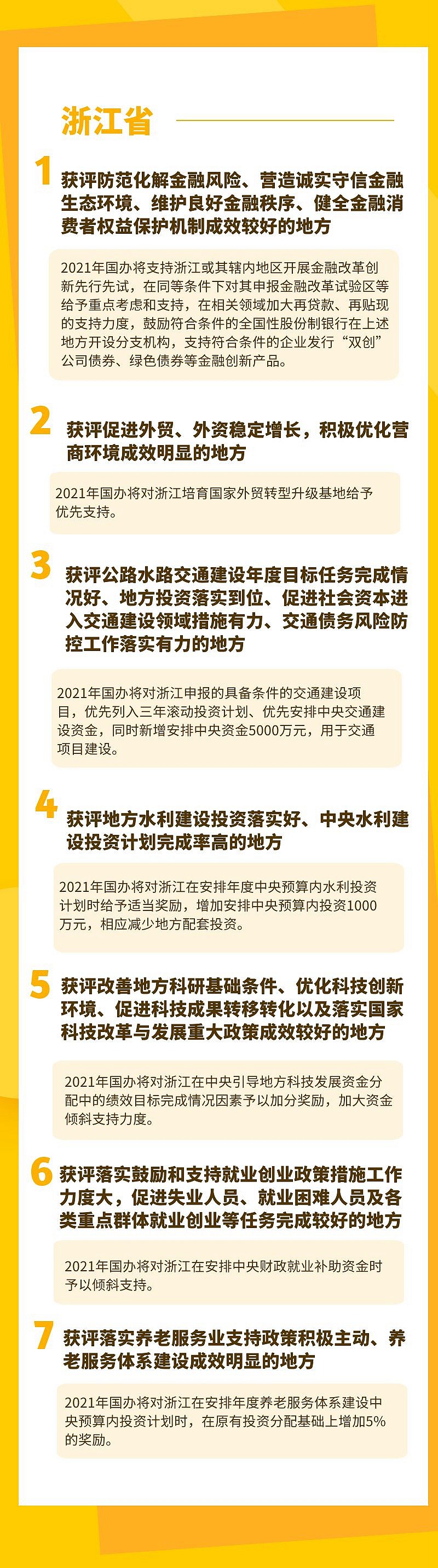 獲評財政預算執行、盤活財政存量資金、國庫庫款管理、推進財政資金統籌使用、預算公開等財政管理工作完成情況好的地方。2021年國辦將對杭州利用年度預算中單獨安排的資金等予以獎勵,每個市獎勵資金不低于2000萬元,每個縣(市、區)獎勵資金不低于1000萬元;