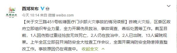 人民網杭州5月12日電 (張麗瑋、郭揚)今天上午10點14分,杭州市西湖區人民政府發布《關于文三路451號錢塘醫療門診部火災事故的情況續報》。詳情如下:昨晚火災后,西湖區委區政府立即組織專業力量,全力開展傷員救治、事故調查、善后處置等工作。截至目前,1人因傷勢過重經搶救無效死亡,2人仍在救治中,2人已出院,13人留院觀察。上午全區立即召開消防安全大檢查工作會議,全面開展消防安全隱患排查整改工作。事故原因仍在調查中。