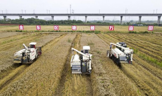 5月13日,金華金義新區塘雅鎮萬畝全域土地綜合整治項目里,首輪試種的1200畝小麥喜獲豐收,數臺收割機在麥田里忙碌。今年以來,金義新區原先種植苗木的低丘緩坡實施土地整治項目,現已形成1萬畝高標準新農田。目前除種植的1200畝小麥喜獲豐收外,還種植早稻面積1580余畝,6月初將種植單季稻5000畝。(胡肖飛)