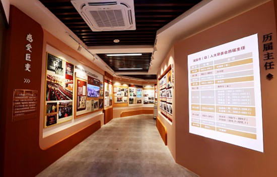 宣傳展示區分為序廳、主廳、照片墻,是瑞安市人大的對外展示窗口。其中,序廳以“一切權力屬于人民”的主題浮雕墻,開門見山點明人大制度的核心意義。主廳依據時間邏輯布局,分“見證歷史”“感受巨變”“砥礪奮進”“追夢前行”四大篇章,將六十五年來瑞安人大工作的生動畫卷徐徐展開。