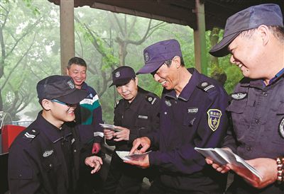 比起其他保安人員,李鵬有一些英語基礎。人年輕,腦子轉得快,就成了玉皇山學習組的組長。每天中午或下班后,他都會帶著組員一起讀單詞、記單詞!皠傞_始時,每讀一個單詞都有人卡殼,很多人不好意思念。我就一遍遍給他們糾正,并鼓勵他們,現在你看,大伙兒念起來又整齊又響亮!”