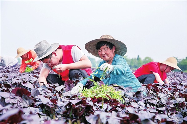 昨天(5月21日),湖州市長興縣虹星橋鎮鄭家村130畝紫蘇長勢正旺,黨員志愿者和村民開展除草作業!白咸K+水稻”高效輪作種植模式,確保水稻適期移栽,幫助農民增收。(陸一平)