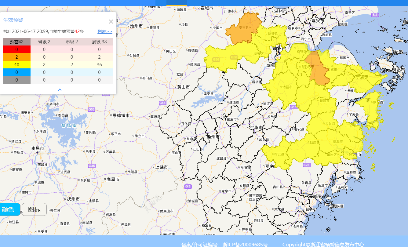 6月17日21時,浙江全省正在生效42條預警信息。