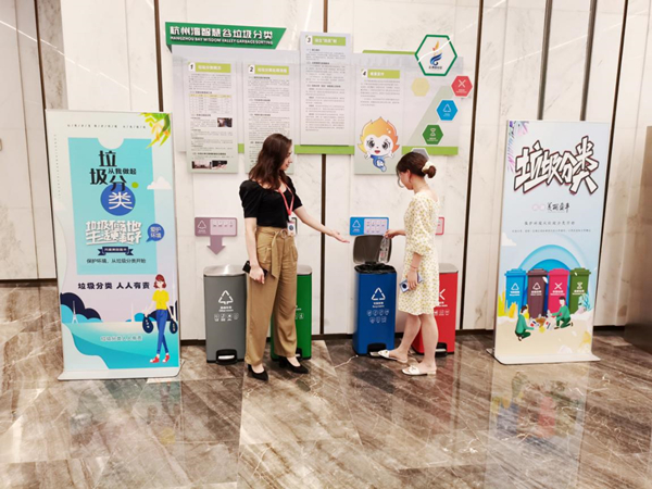 物業人員垃圾分類培訓全覆蓋,辦公區域每層配置四分類垃圾桶,設立紅黑榜垃圾分類管理獎懲機制,建立完善再生資源回收體系……在杭州市蕭山區盈豐街道亞運核心區塊寫字樓博地中心內,一套綠色、無廢、智慧化的商用寫字樓宇垃圾分類體系正在形成。