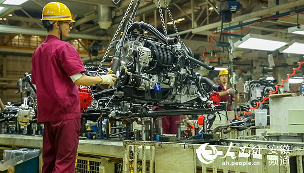 江淮汽車生產線上,工人正在吊裝發動機。人民網 王銳攝