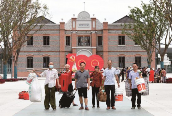 7月3日下午,在嘉興火車站站前廣場,隨著火車站改造提升工程竣工使用,來自江西樟樹的建設者劉友林和幾名老鄉一起背上行李準備搭乘火車返鄉,進站前記者給他們拍下了一張紀念照。