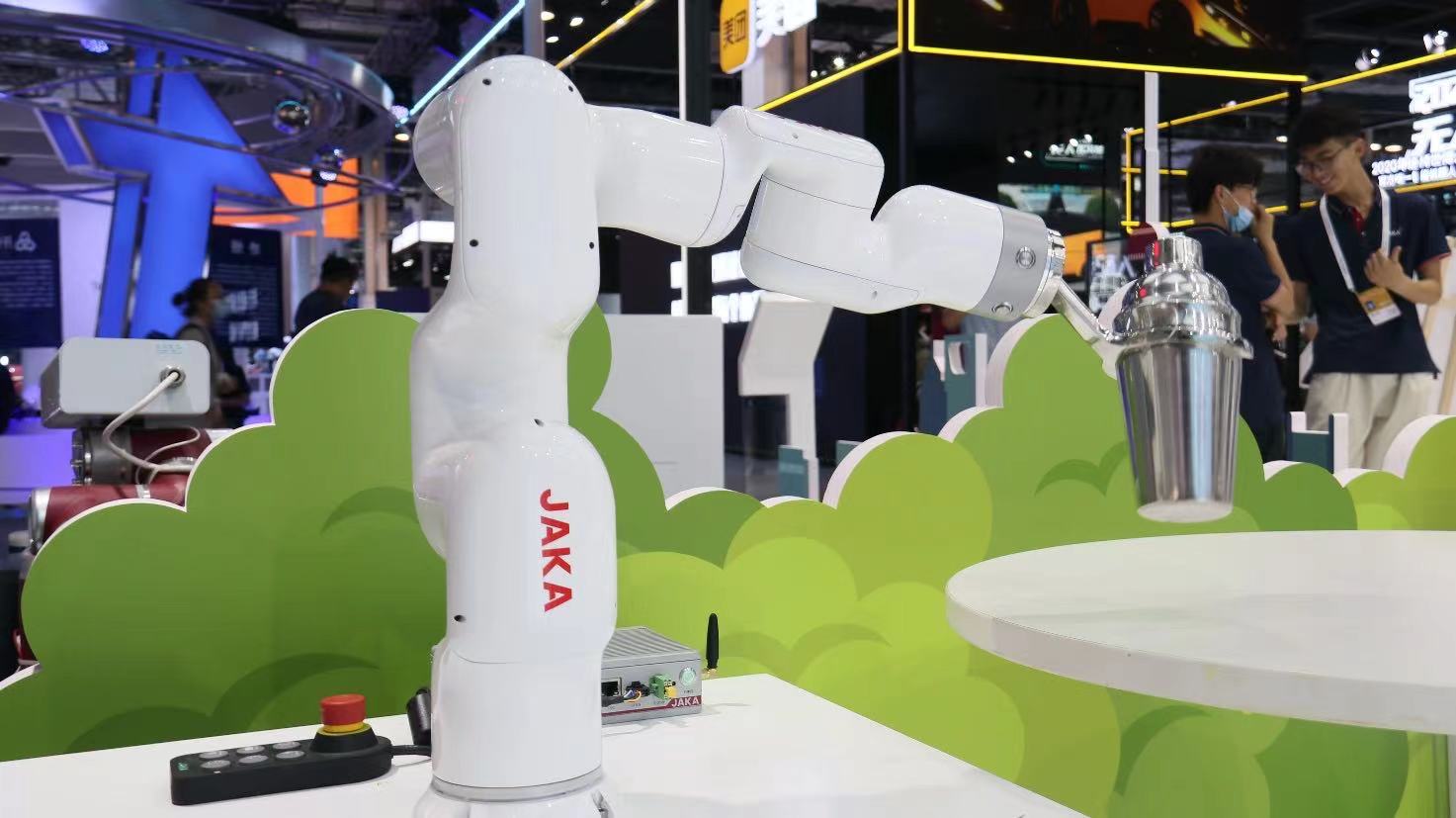 展會上,一個純白色的協作機器人在舞動著機械臂,嫻熟地調酒,動作的熟練程度不亞于一個經驗豐富的調酒師。