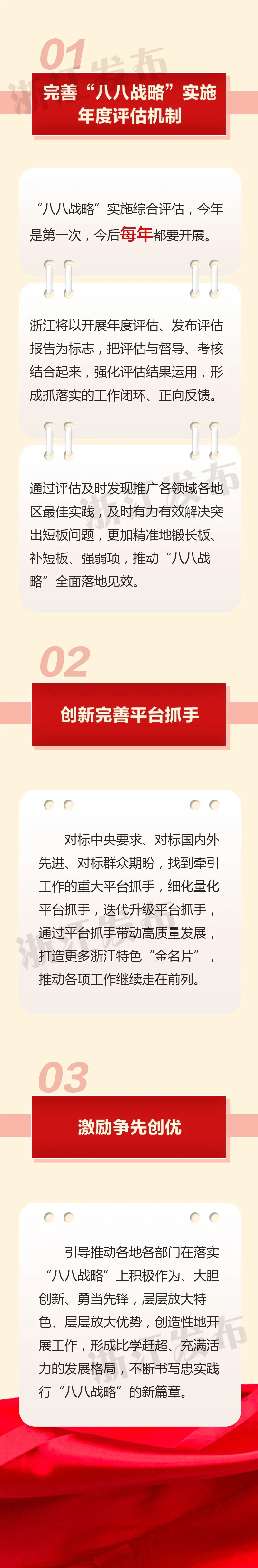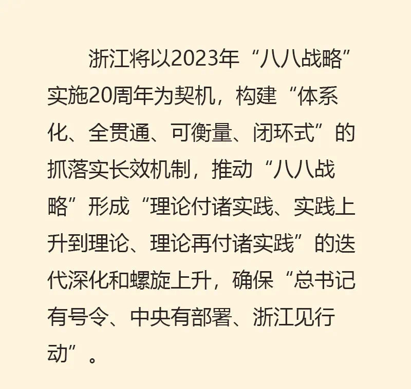 “八八戰略”是習近平總書記為浙江量身定做的引領浙江發展的總綱領、推進浙江各項工作的總方略,是習近平新時代中國特色社會主義思想在浙江萌發與實踐的集中體現。在全國上下深入學習貫徹習近平總書記在慶祝中國共產黨成立100周年大會上重要講話精神之際,回首實現第一個百年奮斗目標的歷史進程,浙江發生的歷史性變化、整體性躍升歸根結底得益于“八八戰略”的科學指引;放眼實現第二個百年奮斗目標新的趕考之路,浙江要在忠實踐行“八八戰略”上更顯擔當、再續華章,不斷開辟干在實處、走在前列、勇立潮頭新境界!