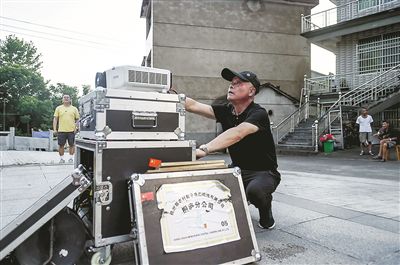 7點一過,天色從明轉暗,氣溫也從35攝氏度慢慢涼下來。杭州市桐廬縣桐君街道麻蓬村尖山區塊村口的小廣場上,許國盛和他的搭檔開始了一天最忙碌的時刻——從車上卸下折疊的支架,還有五米六乘以三米二的放映幕布,手腳麻利地裝好,用捆扎帶固定后再立起來。接著搬下三四個專門的箱子,里面分門別類地裝著功放、播放服務器、投影儀和音響設備,這是晚上放映的全套設備,麻雀雖小,五臟俱全。