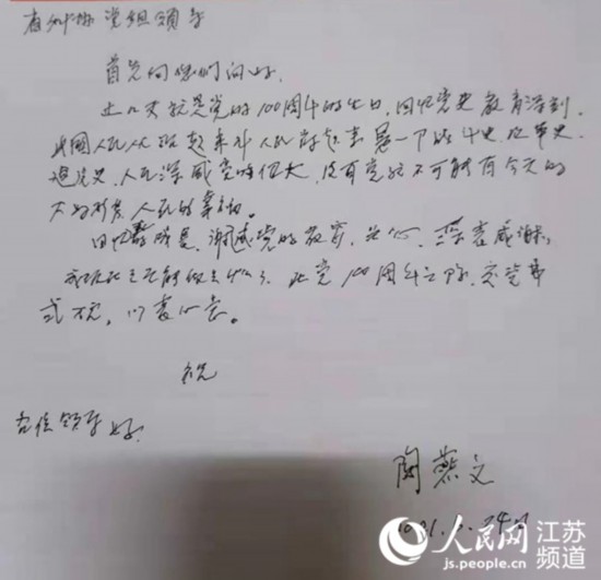 6月25日下午,江蘇省科協黨組書記、副主席孫春雷在省科協“七一”表彰大會上宣讀了這份來信,鼓勵青年黨員牢記入黨初心,向老一輩共產黨員致敬。