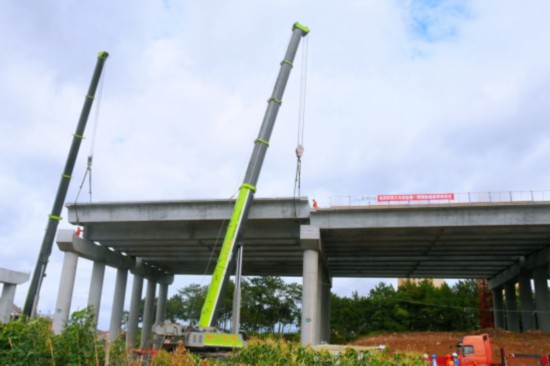 據悉,此次架設的預制加強型中箱梁位于義東項目白云互通1號橋163-166#墩,共計1聯3跨32片,吊裝現場分別使用300噸、400噸的兩臺大型汽車吊進行吊裝。由于預制箱梁體積大、重量重、施工組織技術要求高、梁板運輸困難,為確保梁板運輸及架設過程萬無一失,義東指揮部及參建各方對梁板架設和交通組織方案進行多方會審,聚焦現場交通組織、重型車輛進場線路、吊車擺放位置、起重擺臂角度等問題,以精益求精的工匠精神,反復修改施工組織計劃,確定最優吊裝施工方案,確保了首聯梁板的成功架設。