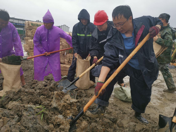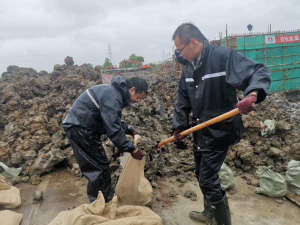 現場,百余人顧不上擦拭臉上夾帶著泥漿的雨水,爭分奪秒抓進度,全力推進加固工程,防止姚江水位上漲倒灌涌入。截至7月24日18點30分,經過3個小時奮戰,堤岸緊急加固完成,1萬余個沙袋全部疊兩層放置到了防洪堤岸上,有效降低了高水位倒灌姚江新城啟動區奧體地塊風險。