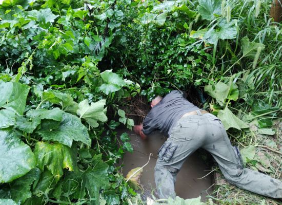 在桐鄉經開區(高橋街道)漕涇村,村書記張鋒在巡查工作中發現張家埭三叉總排水口被堵,先用工具進行清除,但是效果不理想,他直接俯身徒手將堵塞物清除。