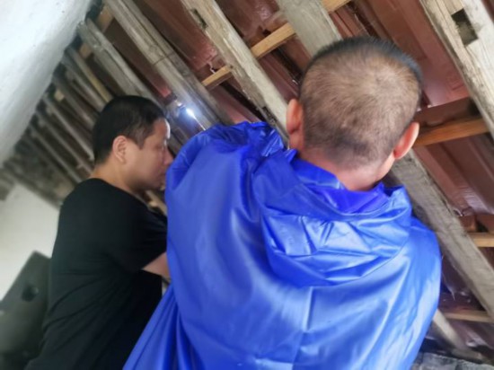 在河山鎮王家弄村,村黨委書記倪劍峰走訪困難戶姚子仁家時,發現他們家的過道琉璃瓦脫落,漏水不斷,發現這一情況后,倪劍峰立馬察看琉璃瓦情況,徒手排好瓦片位置,修復完善,漏水問題得到解決。
