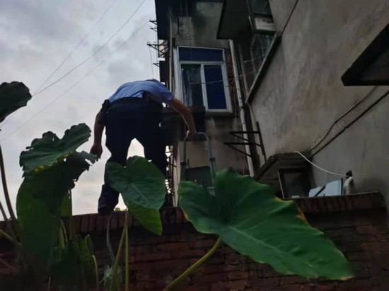 7月24日晚,崇福派出所接到報警稱有人被關在門外,需要幫助。恰好輔警隊員呂明炎和張偉就在附近排摸危房,立即趕到了現場。只見一名頭發花白的奶奶候在門口,“我出去丟垃圾,誰知道門就被大風吹上了,沒有鑰匙,手機也沒有!鼻榧敝,老奶奶找到鄰居幫忙報警。輔警呂明炎環顧四周,“這里可以過去嗎?拿個梯子來,我就可以爬過去開門!痹讷@得房主的允許后,果斷翻越墻頭為老奶奶打開門。