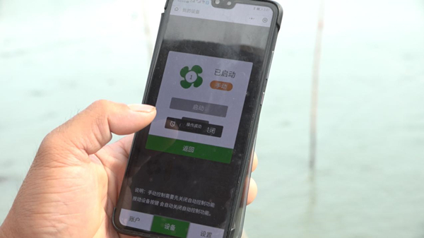 養殖戶施立強正在用手機控制魚塘。李凌攝