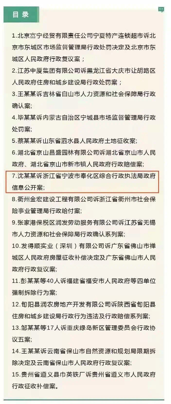 7月29日,最高人民法院發布了15個行政機關負責人出庭應訴典型案例,寧波市奉化區人民法院審理的“沈某某訴浙江省寧波市奉化區綜合行政執法局政府信息公開案”成功入選。