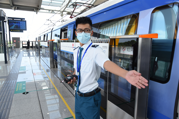 鹽官站站臺崗金晨陽在站臺接發列車,關門時防止乘客沖門。浙江軌道集團供圖