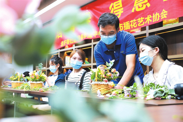 8月9日,湖州市朝陽街道北齊巷社區,湖州市插花藝術協會會長正向居民和花藝愛好者普及中國傳統插花藝術。近年來,湖州各地將家庭花草養護與插花培訓、垃圾分類等公益活動融入基層,倡導建立綠色、環保、低碳、和諧的人居環境。(王潔涵)