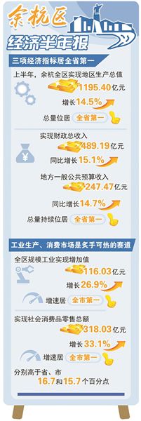 上半年,余杭全區實現地區生產總值1195.40億元,增長14.5%,總量位居全省第一;實現財政總收入489.19億元,同比增長15.1%,地方一般公共預算收入247.47億元,同比增長14.7%,兩項指標總量均持續位居浙江省首位。在工地鋼材碰撞的咣當聲中,在日漸氤氳的煙火氣里,在車水馬龍的繁華燈光中,余杭交出了邁入“十四五”后的第一份“成績單”,主要經濟指標繼續位居省市前列,經濟發展實現“半年紅”。