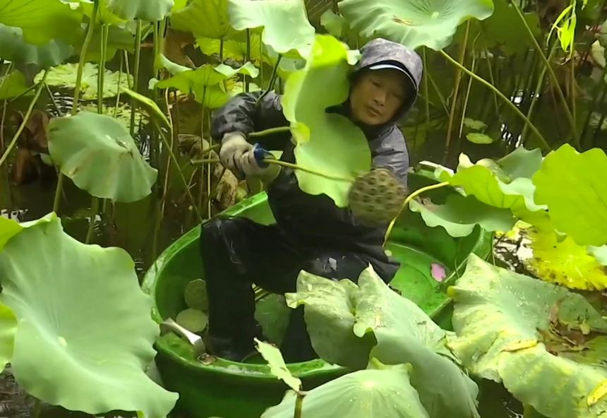 工作人員正在采摘蓮蓬。視頻截圖